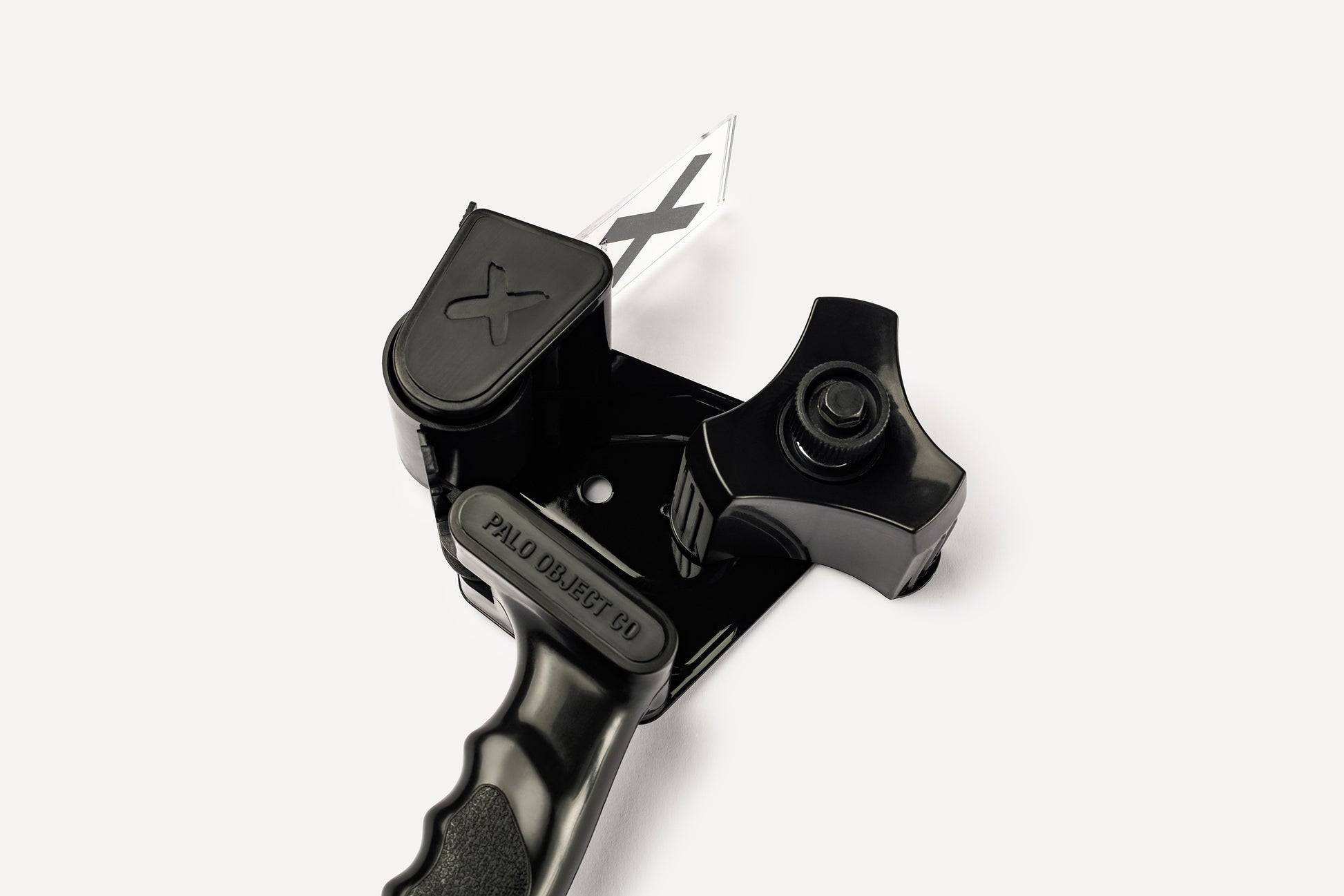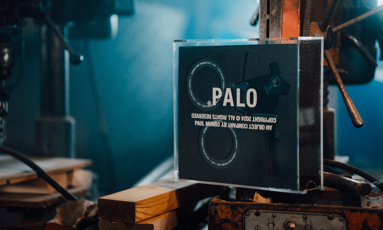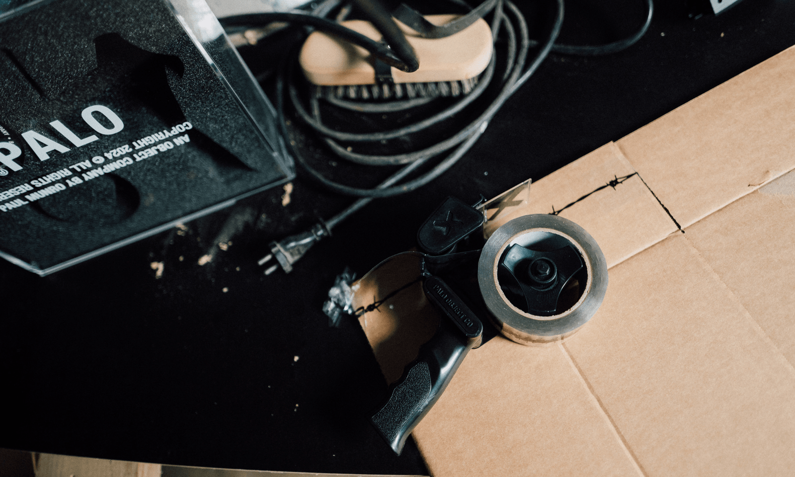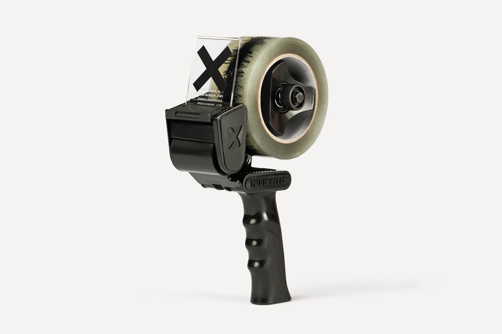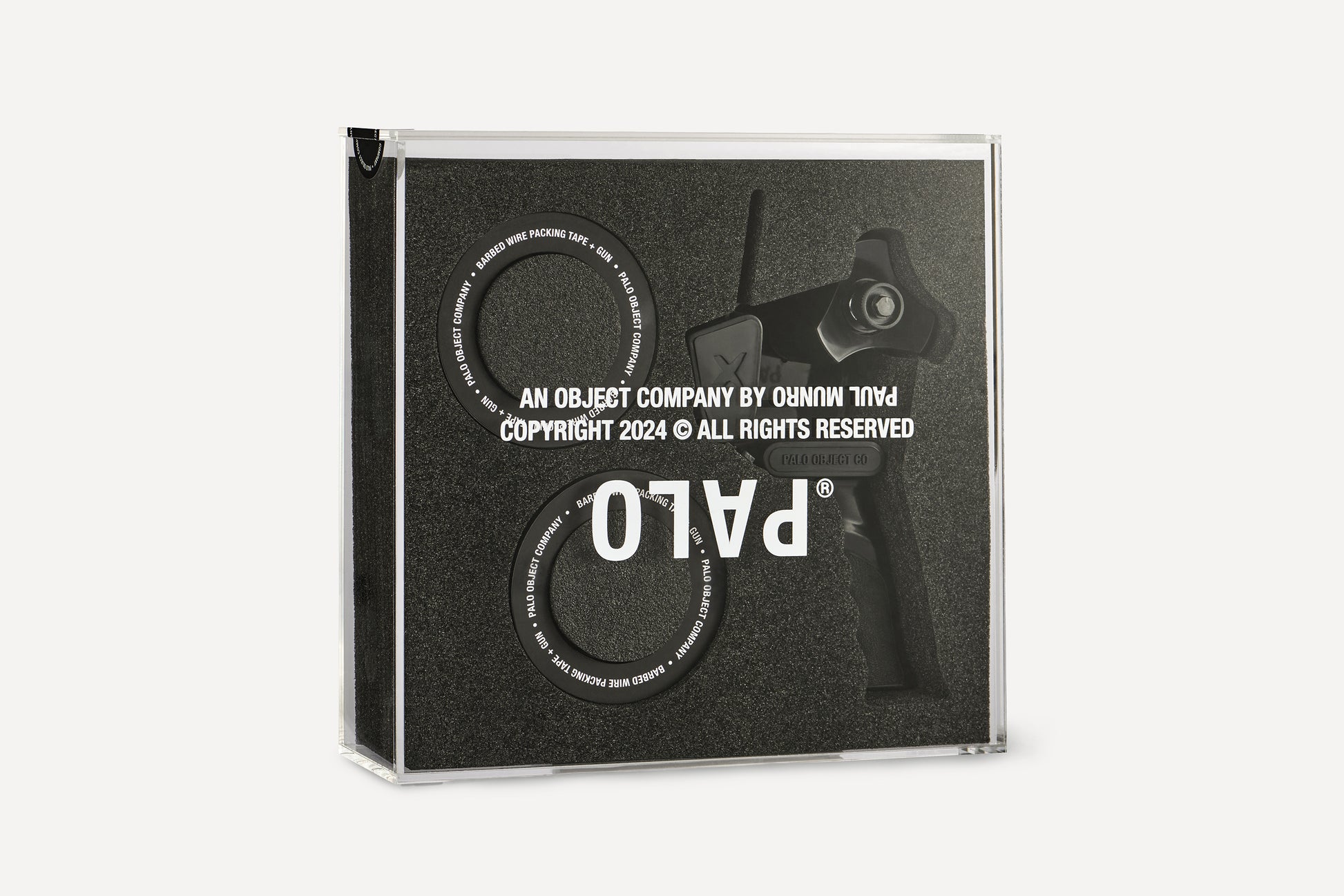 Both barbed wire and packing tape are produced in rolls, their purpose being to separate, protect, or contain. A visual rooted in images of rebellion, resilience, and protection - and seen everywhere from tattoos to fashion to art - barbed wire sits in the spaces of both function and symbolism. This combination of objects draws on that tension between utility and expression, also reimagining an industrial tape gun as something sculptural and deliberate. Finished in blackout form and paired with barbed wire-print packing tape, it reframes the aesthetics of enforced boundaries through a minimal, refined lens - everything then housed within an acrylic case designed to be displayed.