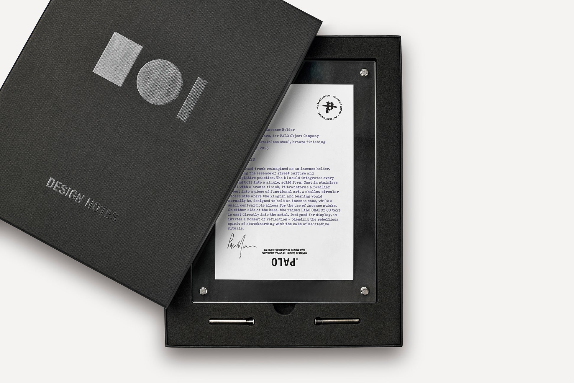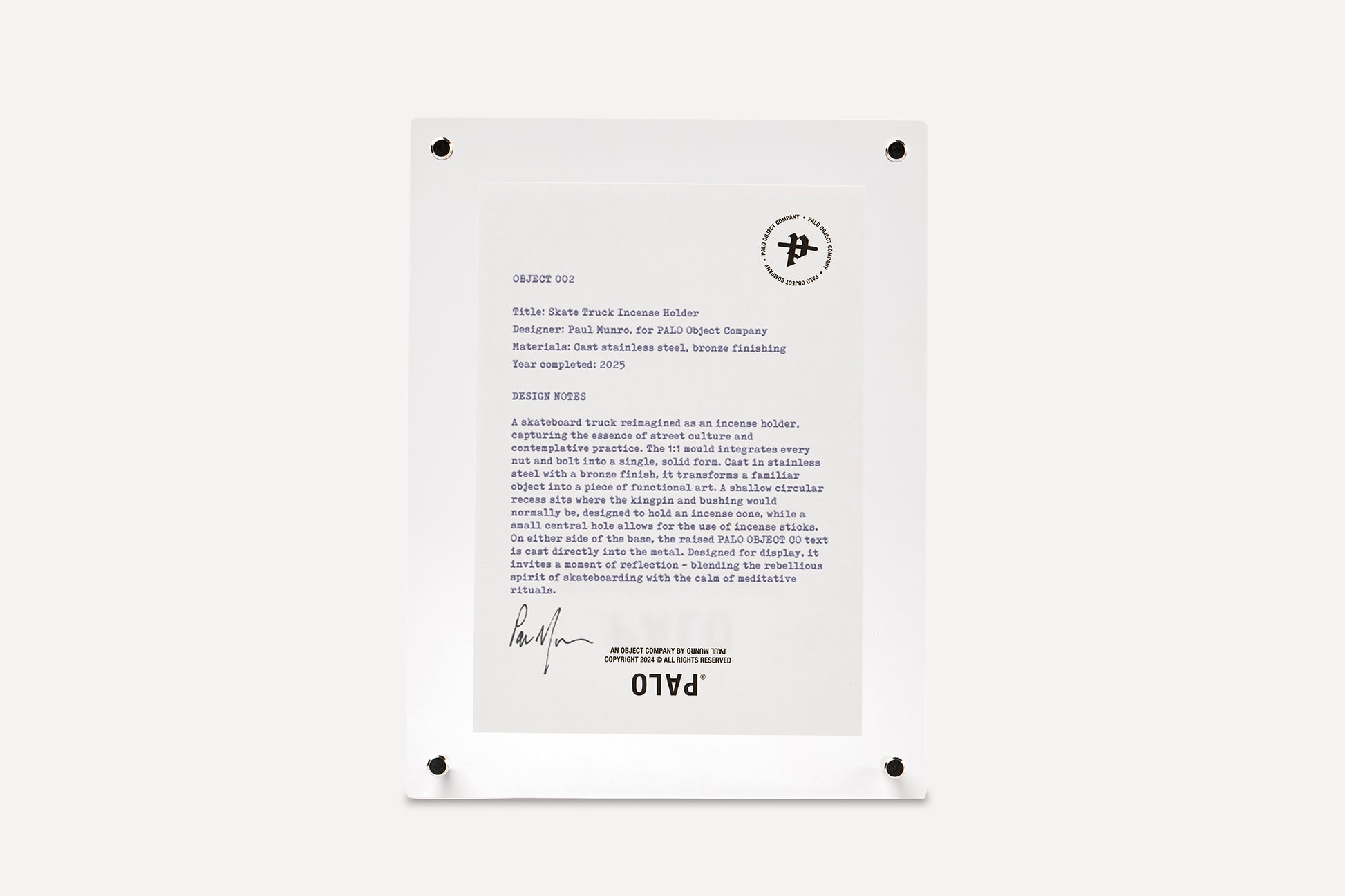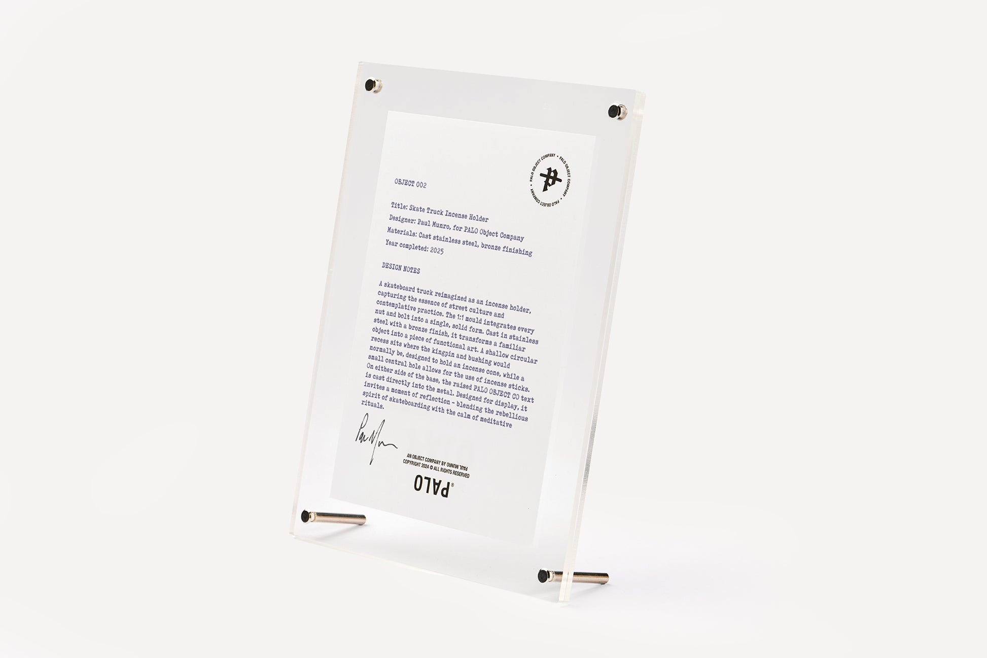 The sheet is held in an acrylic frame using four stainless steel cap screws, with legs supplied for free-standing display. A PALO print is included on the reverse side of the frame, and each piece is shipped in a custom box featuring PALO brand marks.