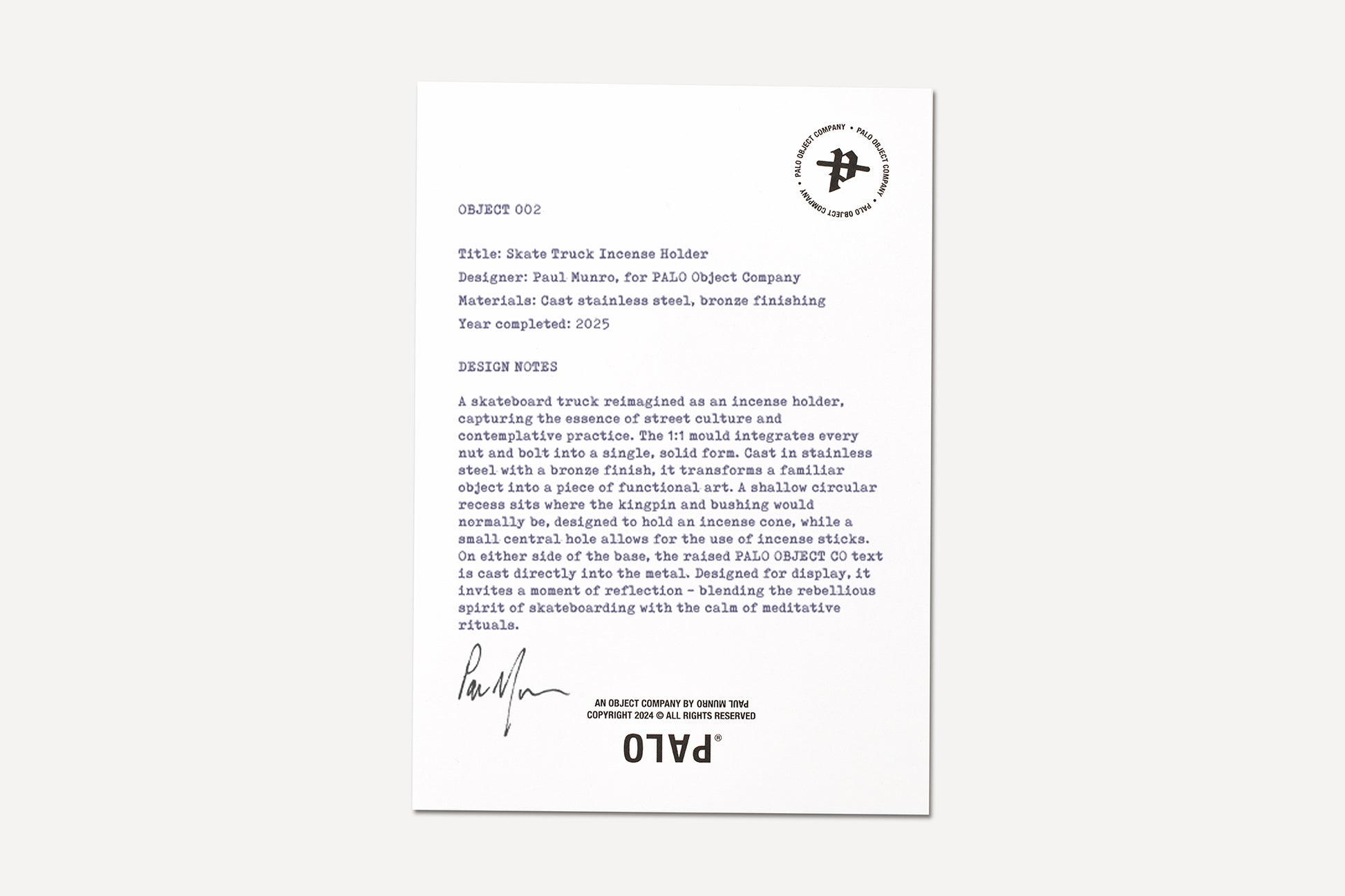 Created to accompany each object designed for PALO Object Company, Design Notes are typed onto premium A5 letterhead featuring the PALO text lockup and the NOT PAUL MUNRO x PALO Object Company mark. A 1970 Olympia Monica typewriter is used for every sheet, which is then hand-signed by the artist.